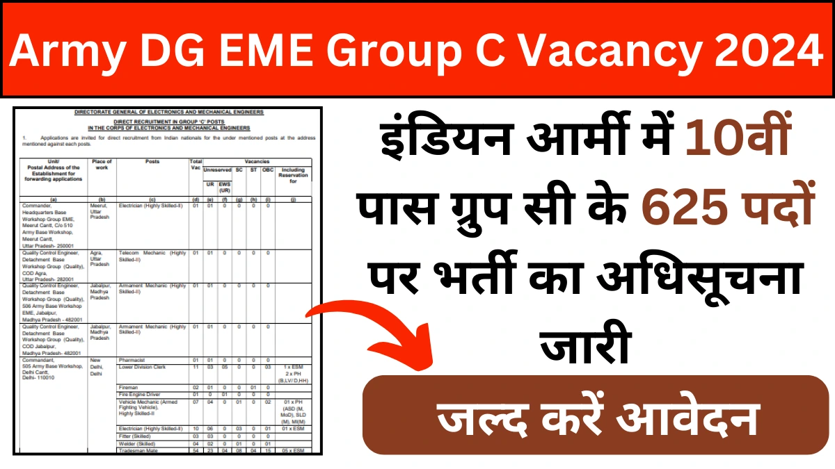 Army DG EME Group C Vacancy 2024: इंडियन आर्मी में 10वीं पास ग्रुप सी के 625 पदों पर भर्ती का अधिसूचना जारी, जल्द करें आवेदन